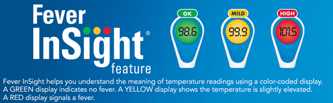 - EASY TO READ – Color coded Fever InSight guide helps get temperature readings at a glance and understand them easily. A green display suggests a normal temperature, yellow signifies an elevated temperature and a red display indicates a high temperature.