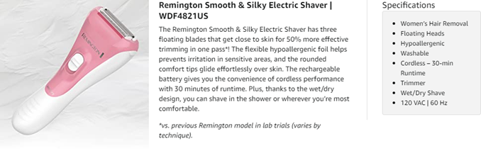 The REMINGTON Smooth & Silky Electric Shaver has three floating blades that get close to skin for 50% more effective trimming in one pass*! The flexible hypoallergenic foil helps prevents irritation in sensitive areas, and the rounded comfort tips glide effortlessly over skin. The rechargeable battery gives you the convenience of cordless performance with 30 minutes of runtime. Plus, thanks to the wet/dry design, you can shave in the shower or wherever you’re most comfortable. *vs. previous Remington model in lab trials (varies by technique).