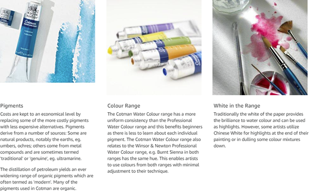 • Winsor & Newton Cotman Water Colours are a range of water colours that are made to our high quality standards but costs are kept to an economical level by replacing some of the more costly pigments with less expensive alternatives.