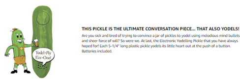 Are you sick and tired of trying to teach your pickles to yodel? Pickles can be so stubborn. At last, the yodeling pickle you've been waiting for. With a mere press of a button (yes, it has a button) this little pickle will yodel its heart out. You'll think you're in the Swiss Alps listening to a yodeling pickle.