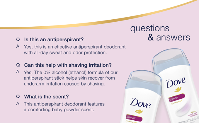 For soft, smooth underarms and invisible protection that lasts all day, look no further than Dove Invisible Solid Powder Antiperspirant Deodorant Stick. Formulated with ¼ moisturizers, this antiperspirant deodorant for women leaves your underarm skin feeling soft and smooth. The 0% alcohol (ethanol) formula helps your underarm skin recover from irritation caused by shaving, too. And it doesn't stop there. This deodorant stick gives you all day antiperspirant protection from underarm sweat and odor, has a powdery scent that indulges your senses throughout the day, and glides on for easy application. Plus, it’s invisible and leaves no white marks behind, so you can stay fresh, comfortable and confident all day long. To get the most out of your antiperspirant deodorant stick, swipe it over cool, dry underarms two or three times until an even layer is applied. Its invisible solid format means you can get dressed and go, without worrying about deodorant stains. At Dove, our vision is of a world where beauty is a source of confidence, and not anxiety. So, we are on a mission to help the next generation of women develop a positive relationship with the way they look - helping them raise their self-esteem and realize their full potential. Globally, Dove does not test on animals, so all of our antiperspirant deodorants are cruelty-free and certified by PETA for added peace of mind.