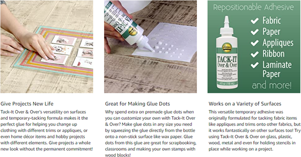 • This is repositionable adhesive allows you put a temporary hold on appliques, ribbon, trim and other embellishments