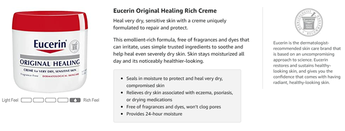 Eucerin Original Healing Cream is a time-tested formula that helps heal and protect extremely dry, sensitive and compromised skin. This thick, rich body cream for dry skin provides intensive moisture for the skin. Eucerin Original Healing Cream binds water to the skin to provide effective moisturization, and this skin cream for dry skin helps prevent moisture loss by replenishing the skin’s moisture barrier. This Eucerin cream is fragrance free, dye free, and non-comedogenic, and is gentle enough for use as a daily dry skin body cream. This Eucerin moisturizing cream is perfect for use as a very dry skin cream, and can also be used as a hand cream or foot cream. To use, smooth this Eucerin dry skin cream onto your skin daily. Eucerin is a dermatologist-recommended skincare brand that is based on an uncompromising approach to science. With skin care products designed to restore and sustain healthy-looking skin, families everywhere look to Eucerin to enhance outer beauty and self-confidence.