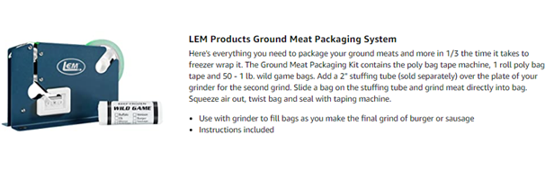 Included Components | Poly bag tape machine, 1 roll of poly bag tape and 50-1lb wild game bags |