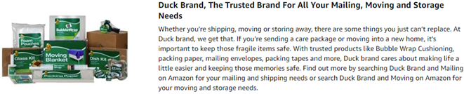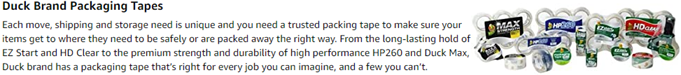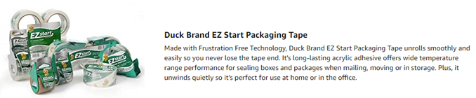 Skip the annoyance of moving and shipping tapes that split or tear. Duck® Brand EZ Start® Packing Tape is designed with Frustration-Free® technology so it always unrolls smoothly, easily and quietly. Featuring a long-lasting acrylic adhesive, you can keep your boxes and packages secure during shipping, moving and storage. Plus, it eliminates the frustration of losing the tape end so you can pack up and leave the stress behind. This clear packing tape unwinds quietly, so it's perfect to use in the office or at home.
