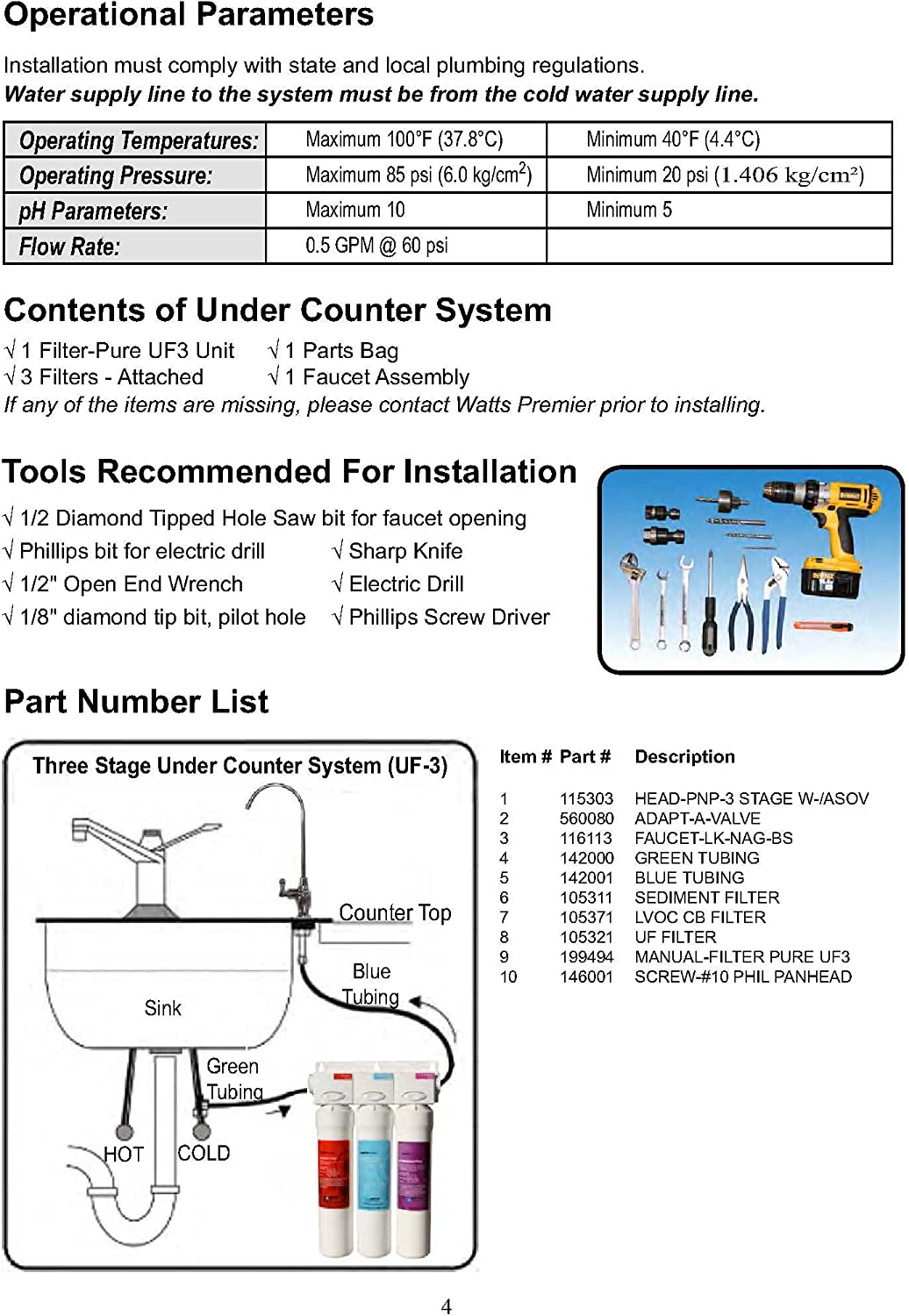 The Watts Premier Filter-Pure UF-3 Water Filtration Device is backed by a three-year limited warranty.