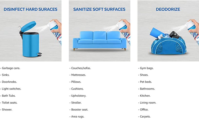 Simply spray it on--it will deodorize and sanitize the area within 30 seconds. For thorough disinfecting and to prevent mold and mildew, spray enough mist to keep surface wet for 10 minutes and let air dry (rinse toys and food-contact surfaces with water after 10 minutes).