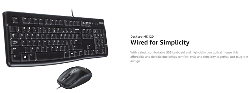Logitech Desktop MK120. A durable duo that brings comfort, style, and simplicity together. You’ll be comfortable with the keyboard thanks to the low-profile, whisper-quiet keys and standard layout with full-size F-keys and number pad. With its thin profile, spill-resistant design,* durable keys that can withstand up to 10 million keystrokes** and sturdy, adjustable tilt legs, this sleek keyboard not only looks and feels good—it’s built to last. Plus, it’s got easy-to-read keys. The high-definition optical mouse puts comfort and control in your hands with smooth, accurate tracking and a comfortable, ambidextrous shape. And setup is simple—you just plug your keyboard and mouse into USB ports and start using them right out of the box. * Tested under limited conditions (maximum of 60 ml liquid spillage). Do not immerse keyboard in liquid. ** Excludes number lock key.