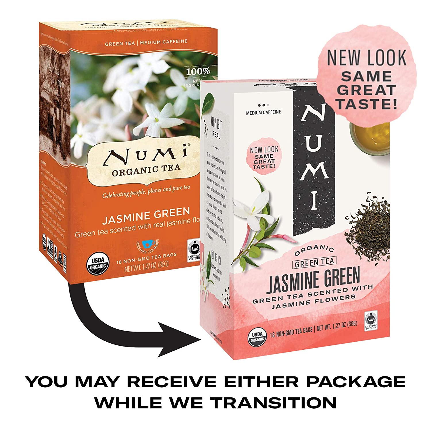 Numi Organic Tea Jasmine Green, 18 Count Box of Tea Bags (Pack of 3) (Packaging May Vary)