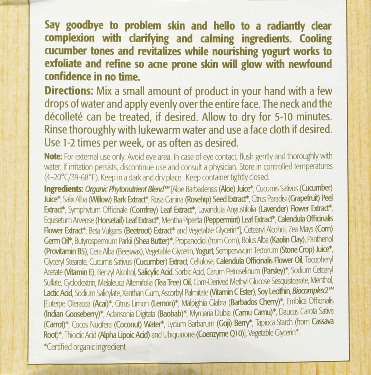 • Emulsify a small amount of mak in your hand with a few drops of water. Apply evenly over the entire face as well as the neck and décolleté areas if desired. Allow mask to dry 5–10 minutes then gently scrub off in a circular motion with a lukewarm face cloth. Rinse thoroughly with clear water.