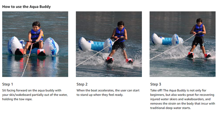 • WATER SKIING TIPS: When seated on the Aqua Buddy, skiers should hold onto the tow rope while the boat slowly advances. When the rope has no slack and starts to pull the skier, simply focus on balancing the skies and stand up, leaving the Aqua Buddy behind