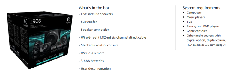 - System Requirements: Works with any device with either a headphone jack (3.5 millimeters), RCA, six channel direct, digital coaxial input or optical inputs. Signal to noise ratio, A weighted: >95dB