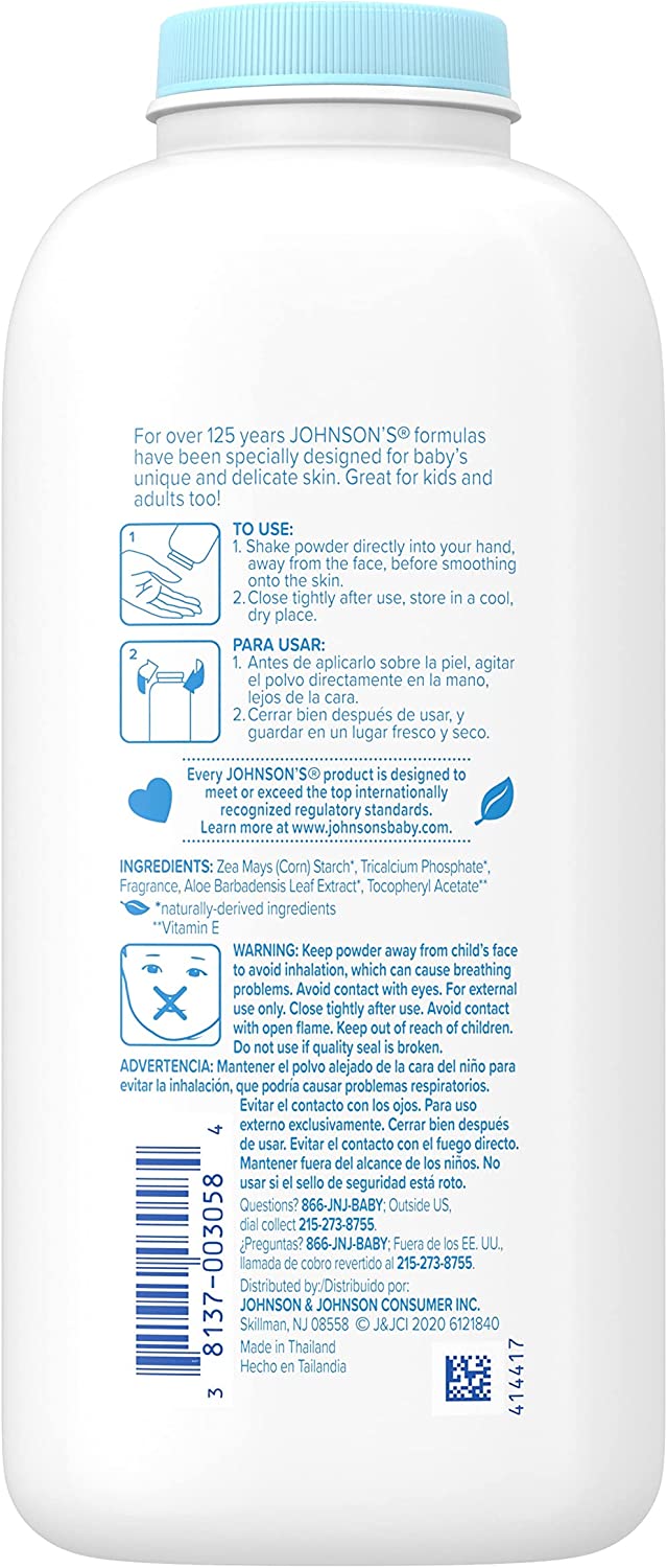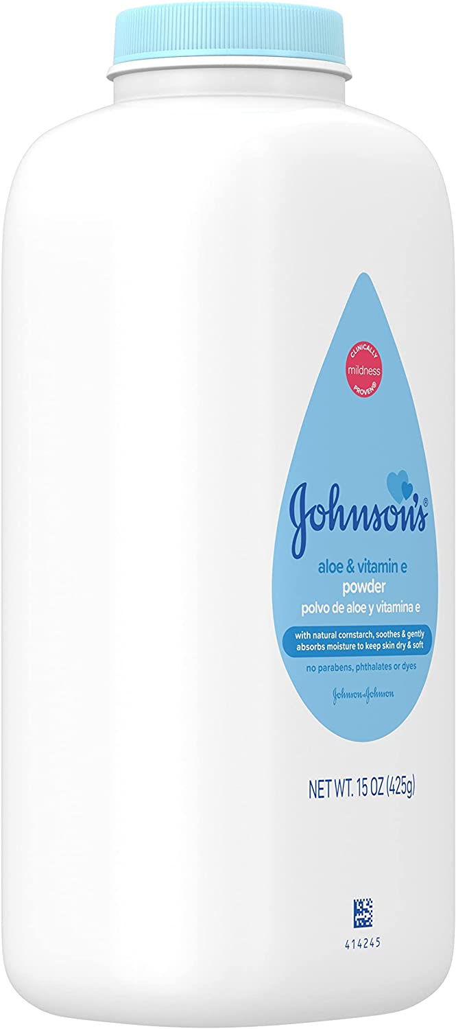 • 15-ounces of Johnson's baby powder with naturally derived cornstarch, aloe, and vitamin E provides a gentle way to soothe your baby's skin and leave it feeling soft and smooth