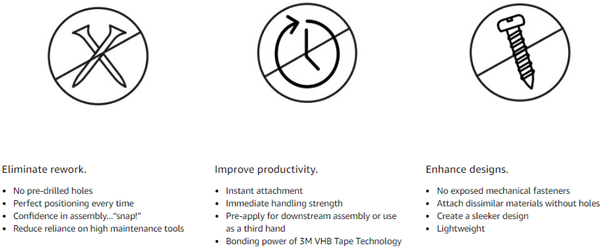 • SMOOTH AESTHETICS, Attachment with 3M VHB Tape technology eliminates any visible mechanical fasteners and improves the final look of your project