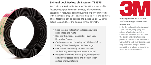 3M Dual Lock Low Profile Reclosable fastener. TB4570 is a low surface energy adhesive on the back of a clear polypropylene Reclosable fastener. This product is half the thickness of standard 3M Dual Lock Reclosable Fasteners, providing a low profile attachment. An alternative to screws and bolts, this hidden fastener provides a snug fit and smooth aesthetic appearance. A low surface energy adhesive on the back of a black polypropylene reclosable fastener. Low profile. 0.10 inch engaged thickness. Closure life 100.