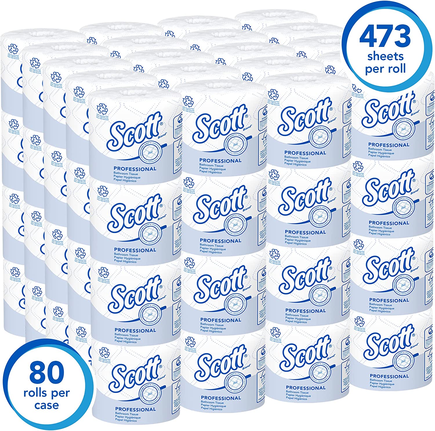 • 473 Sheets/Roll, 80 Scott Professional 100% Recycled Fiber Standard Roll Toilet Paper Rolls/Case; 37,840 Sheets/Case; with Elevated Design; 2-Ply; White; Individually wrapped rolls