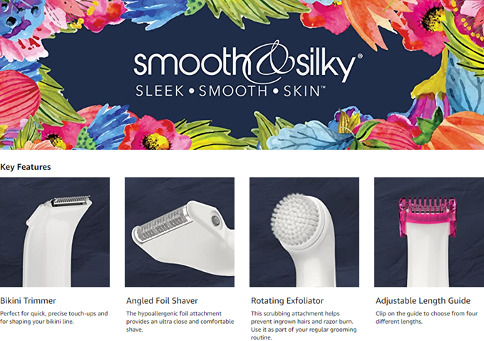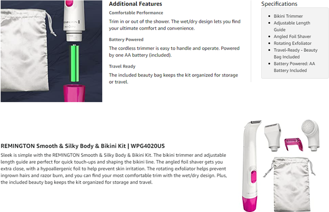 Sleek is simple with the REMINGTON Smooth & Silky Body & Bikini Kit. The bikini trimmer and adjustable length guide are perfect for quick touch-ups and shaping the bikini line or even the face. The angled foil shaver gets you extra close, with a foil to help prevent skin irritation. The rotating exfoliator helps prevent ingrown hairs and razor burn, and you can find your most comfortable trim with the wet/dry design. Plus, the included beauty bag keeps the kit organized for storage and travel.
