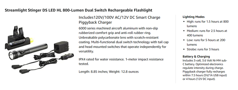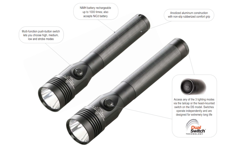 The Streamlight 75458 Stinger DS LED HL is a high lumen flashlight that provides 800 lumens of maximum illumination. Its wide beam pattern gives you a bright flood light that will light up the area around you, and the switches on the head and tail cap provide maximum versatility. Compact and extremely powerful, the Stinger DS LED HL rechargeable flashlights offer 3 microprocessor-controlled intensity modes, strobe mode and the latest in high power LED technology. The Stinger DS LED HL includes a second independent easy to locate tactical tailcap switch. The combination of rechargeable batteries and the C4 LED results in one of the lowest operating costs of any flashlight made. 3 Lighting Modes plus Strobe. High for maximum illumination: 800 lumens; 310m beam, runs 1.5 hours, 24,000 candela; Medium for intense brightness and longer run time: 400 lumens, 219m beam, 2.5 hours, 12,000 candela; Low for extended run time: 200 lumens, 155m beam, runs 5 hours, 6,000 candela. 3-Cell, 3.6 Volt Ni-MH sub-C battery, rechargeable up to 1000 times. Smart PiggyBack charger: Fully recharges within 7.5 hours (5V/1A USB input) or 4 hours (12V DC input). Machined aircraft aluminum body with non-slip rubberized comfort grip; anti-roll rubber ring included. IPX4 water-resistant; 1 meter impact resistance tested. Unbreakable polycarbonate lens with scratch-resistant coating. LED technology, impervious to shock with a 50,000 hour lifetime. 8.85” (22.48 cm); 12.8 oz (364 g). Serialized for positive identification. Limited lifetime warranty.