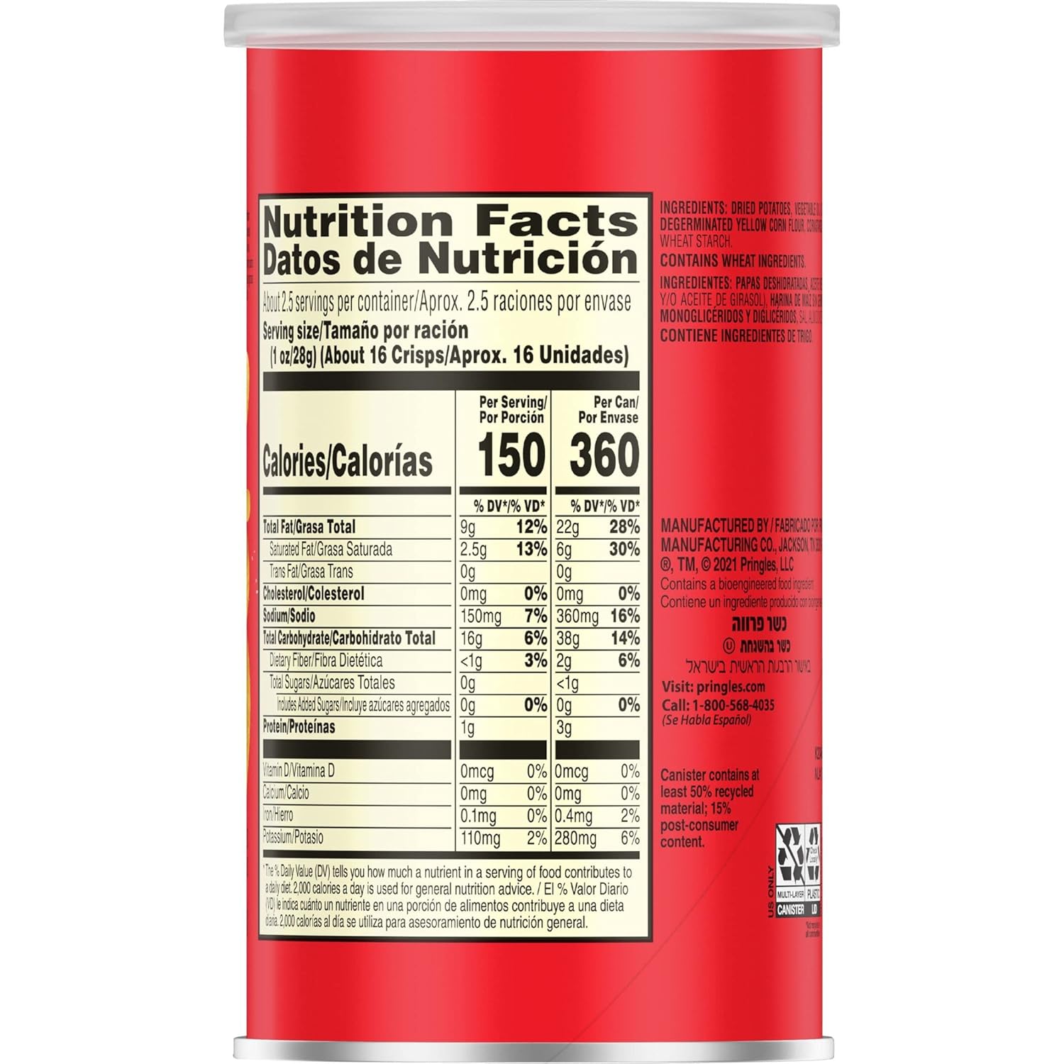 What comes next after the "pop" of an Original Pringles Grab N' Go can? The crisp flavor of the classic Original potato crisp that hits the spot every time. Insanely light, crispy and never greasy, each crisp is ingeniously shaped and satisfyingly tangy. With this convenient individual size can, it's easy to create your own snacking moments wherever and whenever, like grabbing a can as an after-school pick-me-up or packing into lunch boxes; Bring a can for game time plus some for other Pringles fans. Stash a can in your work desk or pantry to enjoy anytime. Share Pringles at your next get-together to turn up excitement among family and friends. Get your hands on Pringles Original Potato Crisps for awesomeness that keeps you coming back, stack after stack.