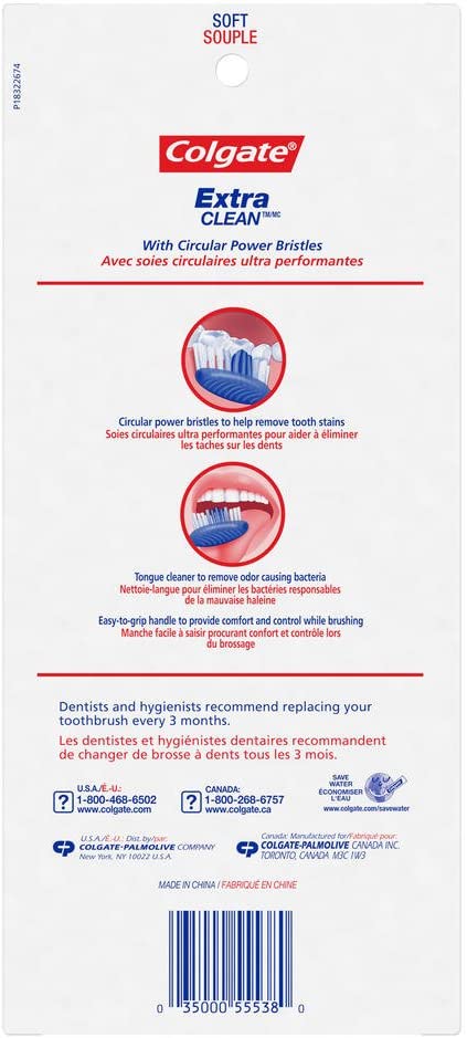 Colgate Extra Clean Full Head Soft Toothbrush is designed with circular power bristles to help remove tooth stains. Its cleaning tip bristles effectively reach and clean back teeth and between teeth. This manual toothbrush also has an easy-to-grip handle to provide comfort and control while brushing. Remember to change your toothbrush every 3 months.