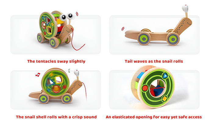 The push-pull toy has three differently shaped holes (triangle, circle, and square). The opposite side features an elastic-banded opening for easy yet secure access to the inside the snail’s shell.