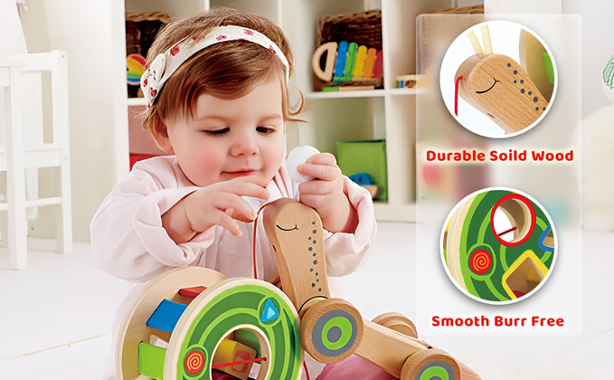This multi-tasking snail tows a shell full of wooden blocks as he tags along behind you, waving his tail. Kids ages 12 months to kids of 5 years can lighten the load by removing the colorful shape sorter, and getting him ready to roll alone.