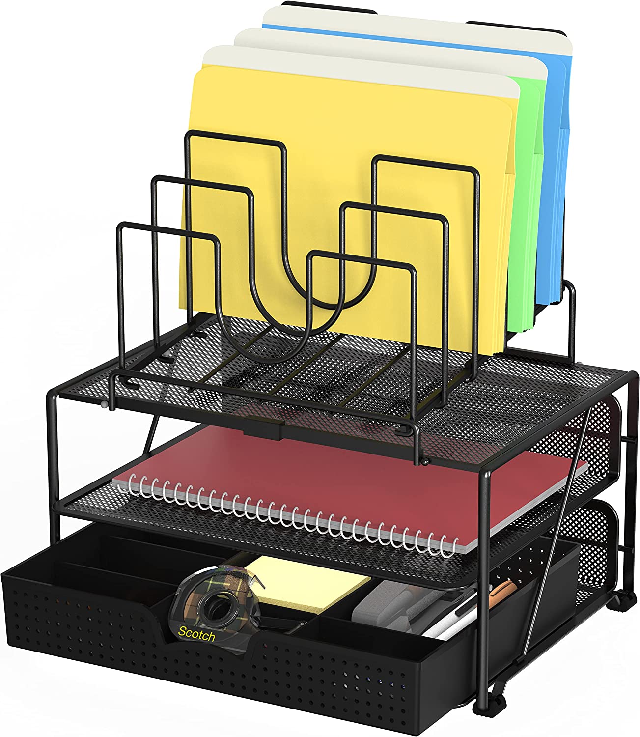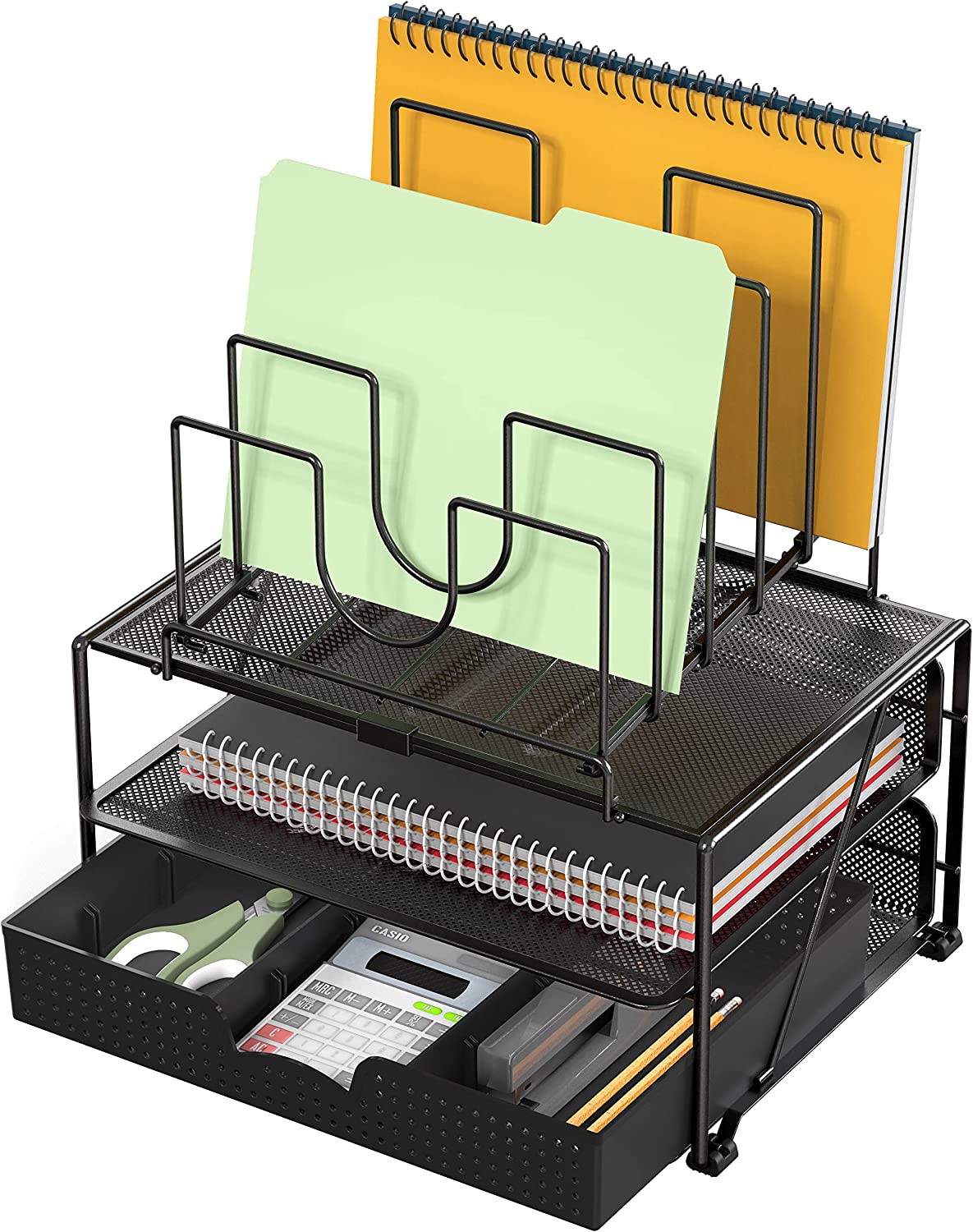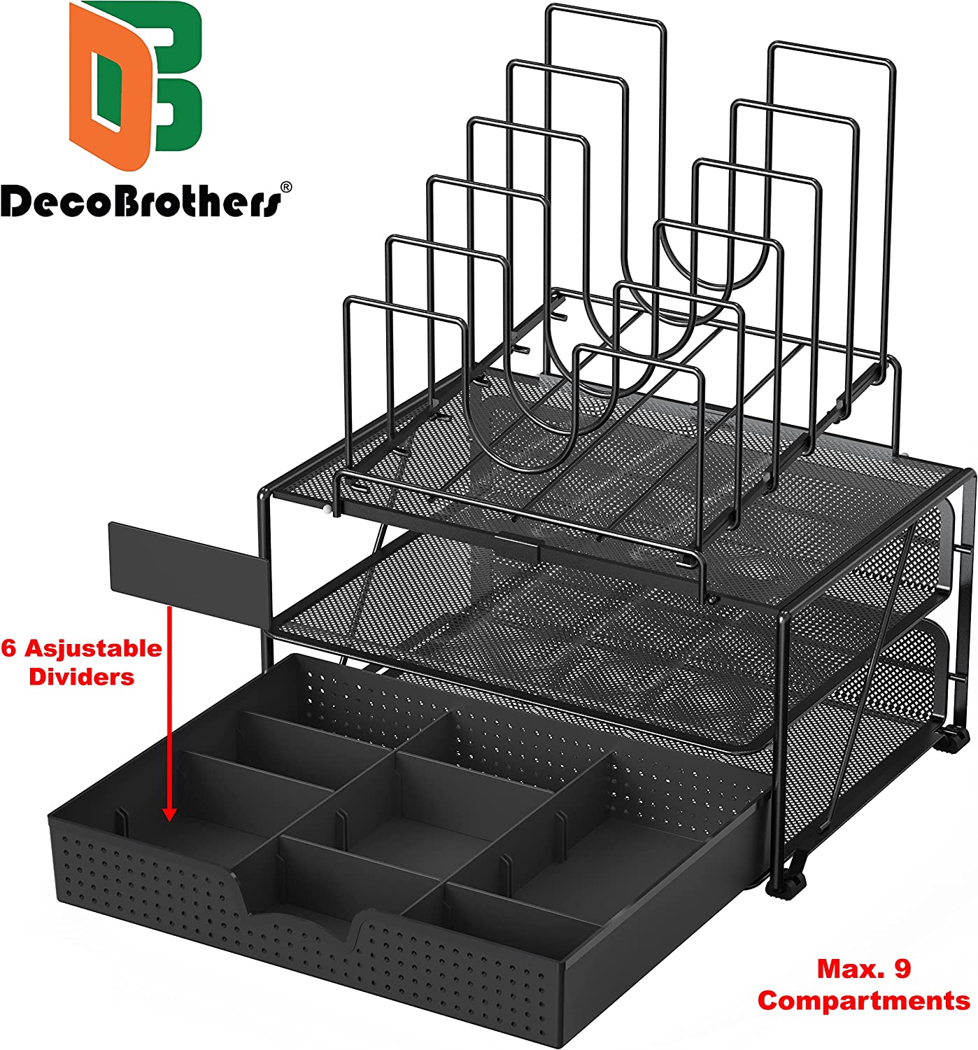DecoBros Mesh Desk Organizer with Double Tray, 5 Stacking Sorter Sections and Sliding Drawer, Black