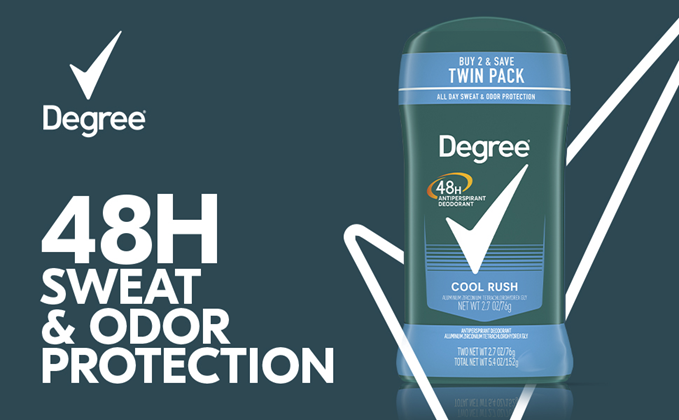 Degree Men Cool Rush Antiperspirant Deodorant delivers 48-hour sweat and odor protection to keep you feeling dry and fresh. This antiperspirant deodorant for men works as hard as you do and offers 48-hour protection, so you can take on the day. Our Cool Rush Antiperspirant Deodorant features a refreshing kick of crisp, arctic freshness. The powerful antiperspirant deodorant responds when you need it most, so you can stay confident without having to worry about slowing down. You can be confident you’ll be protected from sweat and odor by this antiperspirant for men. Stay fresh and feel clean from morning to night. Simply twist, glide and get moving. The crisp, energizing scent helps to keep you as fresh as when you started your day. Stay dry, cool, and confident thanks to Degree Men Cool Rush Antiperspirant Deodorant. At Degree, we want to inspire the confidence in everyone to move more and go further. We’re here to support your journey through an antiperspirant that moves with you and helps you go beyond your limits. As well as increasing our use of reusable materials, we’re making it easier for you to recycle our antiperspirant and dry spray packaging. Degree. It won’t let you down.