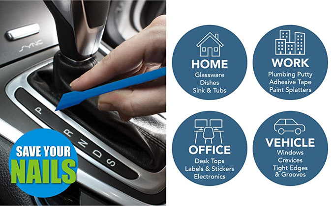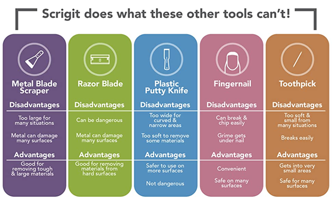 - Save Your Nails with Scrigit Scraper - The ultimate multi-use plastic scraper tool! This super simple tool works for so many daily tasks around your home. Not only is it an ideal dried-on food scraper tool, it works great as a label scraper, sticker remover tool and lottery ticket scratcher tool.