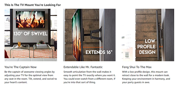 Hang with us. Mount your large TV with a tested & highly rated wall mount. You’ve finally got a 65” beauty of a TV. Why limit it's functionality by leaving it sit on the cheap plastic stand it came with? With a large full motion TV mount, you can extend, swivel, and tilt to your heart's desire, all while keeping your TV (and family members) safe.