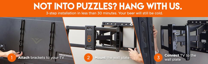 • Get your TV off it's stand and onto the wall in under 30 minutes with this DIY friendly full motion TV wall mount that does it all. Thanks to the helpful install manual and full assortment of hardware, it's compatible with almost every TV out there.