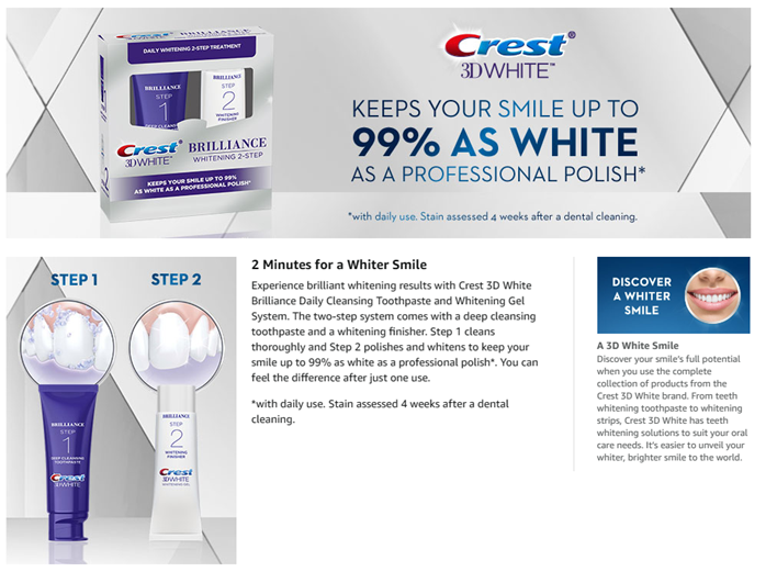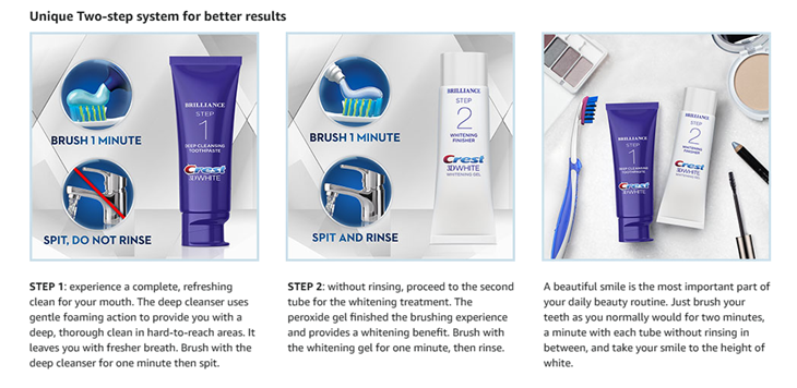 Upgrade your Oral Care Routine. Feel the difference of a 2-step system that you can use everyday. 2 Minutes twice daily for a Whiter Smile. Experience brilliant whitening results with Crest 3D White Brilliance daily cleansing toothpaste and whitening gel system. The two-step system comes with a deep cleansing toothpaste and a whitening finisher. Step 1 cleans thoroughly and Step 2 polishes and whitens to keep your smile up to 99% as white as a professional polish*. You can feel the difference after just one use. *with daily use. Stain assessed 4 weeks after a dental cleaning.