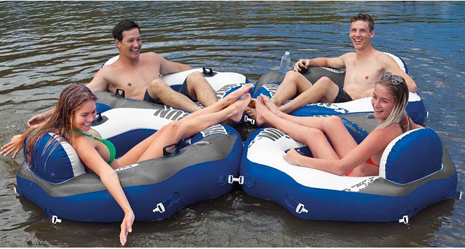 This Intex River Run Connect Lounge tube allows you to relax in style and with your friends or favorite beverage within close reach. The easy-to-use connectors fasten it to an Intex River Run Connect Cooler or additional River Runs to create a floating convoy of fellow tube goers. Designed with a built-in backrest for easy cruising and a mesh bottom that keeps you coo and has two air chambers for added safety, plus a built-in cup holder to keep your refreshment nearby as you relax in the water.