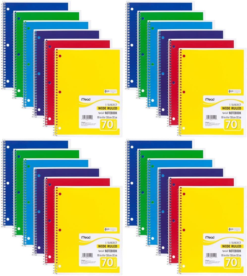 Mead Spiral Notebook, Wide Ruled, 1 Subject, 70 Sheets, 8 x 10.5 Inches, Assorted Colors (05510) Pack of 24