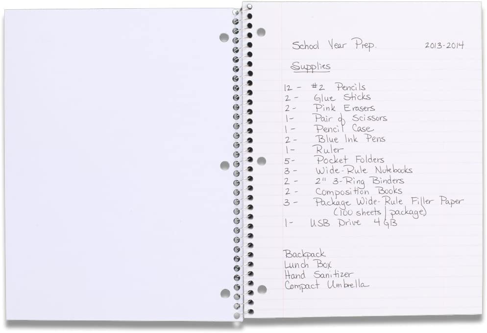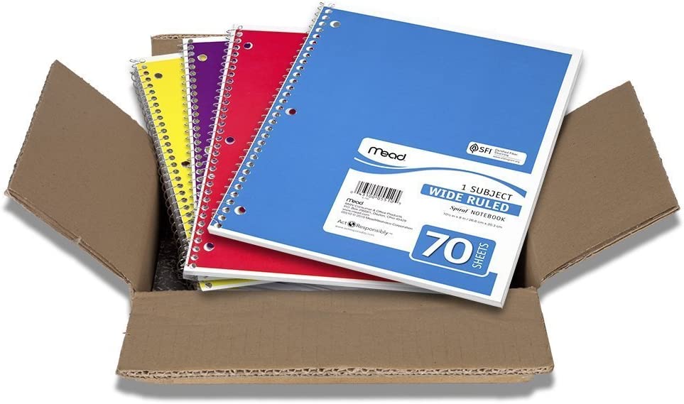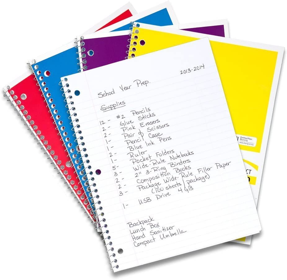 Stay Organized Mead notebooks are a school supply essential. There is no easier way to keep your class notes organized, as the pages never slip out. This set includes four, 1-subject, spiral bound notebooks with assorted color covers. Simply write the subject name on the lightweight cover, or color code all your supplies for each class by the color of the notebooks. Each notebook contains 70 sheets of wide ruled paper--perfect for a quarter, semester or special project. As a standard notebook, this 4 pack is great for back to school. Students, teachers and parents can all find a convenient use for a spiral notebook. Teachers and parents, for example, can use these notebooks to jot down notes and keep the information that is discussed at PTA meetings organized. Each notebook is 3-hole punched so that it can be easily inserted into a 3-ring binder.