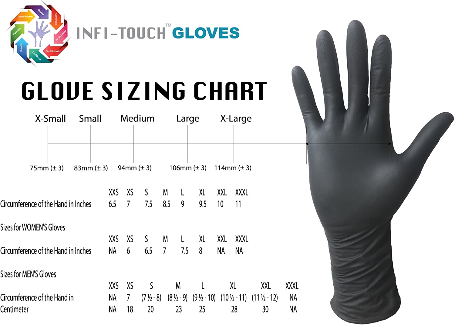 Infi-Touch Gloves combine the protection of Nitrile with the sensitivity of Latex. Our manufacturing process boosts the glove's tensile strength (the force to break through the glove) to increase its already superior barrier protection. The process boosts glove thickness, so less force is required to stretch the material. The result is a powder free glove with dexterity and sensitivity. This glove is great for use in cleaning, maintenance, cleanup, tattoo, Law Enforcement, Homeland Security, Laboratory & more. These non-sterile ambidextrous gloves are puncture and abrasion resistant and provide resistance to a wide variety of chemicals. Each box includes 50 gloves (25 pairs). Please Note If you are allergic to proteins, latex gloves may not be fit for you. Not made for those who are sensitivities to latex.