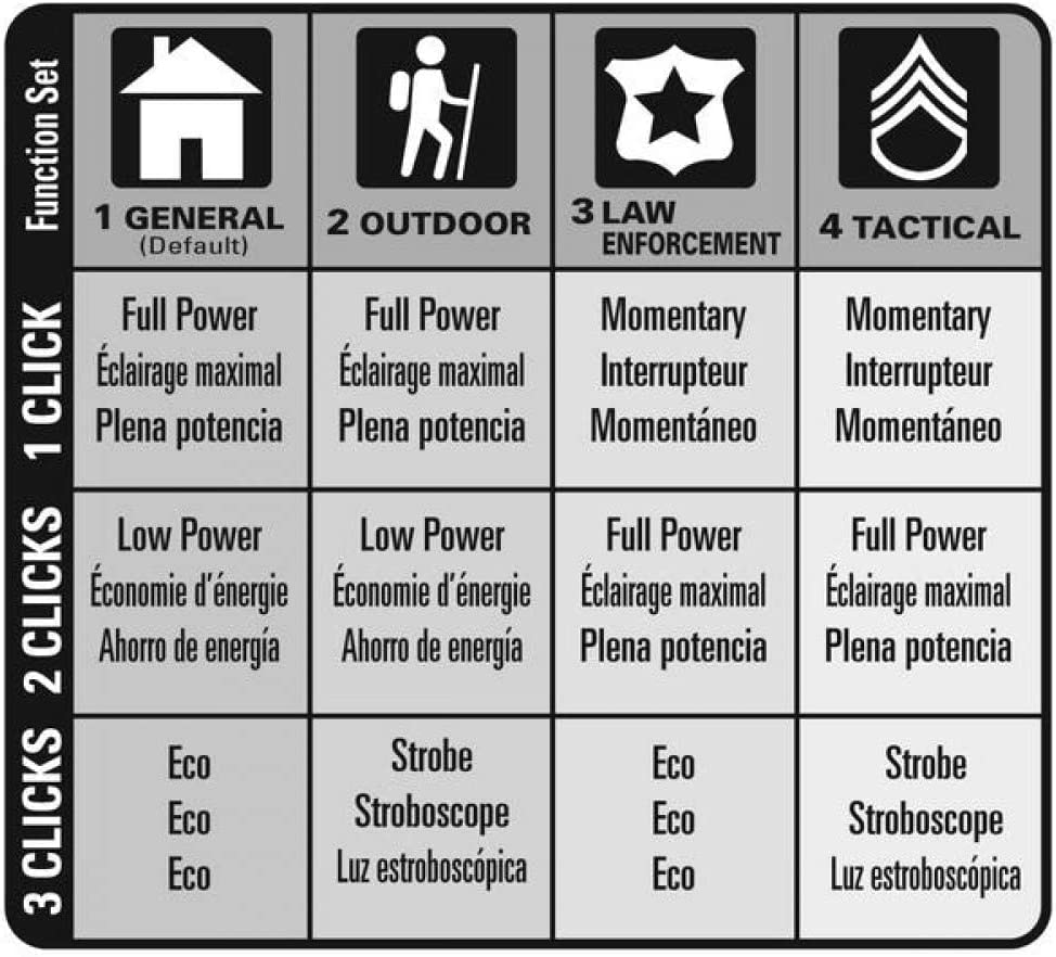 • Four activity based function sets to choose from: General, Outdoor, Law Enforcement and Tactical
