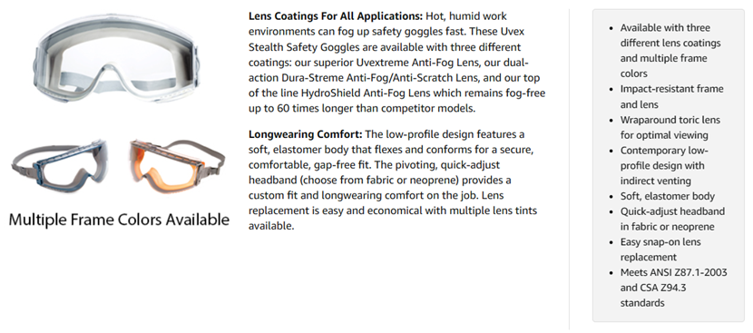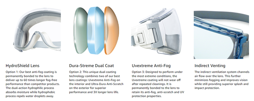 Protect your eyes from airborne debris, chemical splashes and impacts with the Uvex Stealth Safety Goggles with Uvextreme Anti-Fog Coating & Neoprene Headband. The contemporary low-profile design of these safety goggles features a soft, elastomer body that flexes and conforms to the face for a secure, comfortable, gap-free fit. The clear toric lens with Uvextreme anti-fog coating provides superior optics for excellent vision in most indoor work environments. A pivoting, quick-adjust neoprene headband allows for a customized fit and longwearing comfort on the job. Lens replacement is easy and economical. Safe and durable, these goggles meet ANSI Z87.1-2003 and CSA Z94.3 standards.