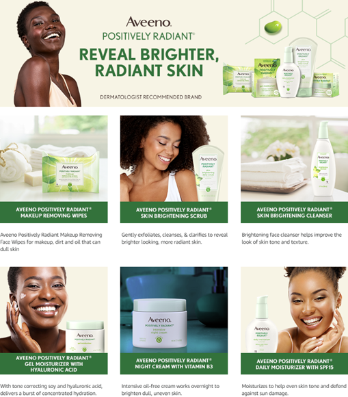 - Aveeno Positively Radiant Night Cream with soy gently improves skin tone and texture, helps reveal brighter, more radiant looking skin. Use in your nightly skincare routine to reduce the look of dark spots and reveal healthy-looking skin