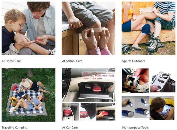 ● 12. First Aid Kit 20x13x5cm 1pcs ● 13. Whistle 1pcs ● 14. Safety pins 10pcs ● 15. hand-pressing flashlight 1pcs