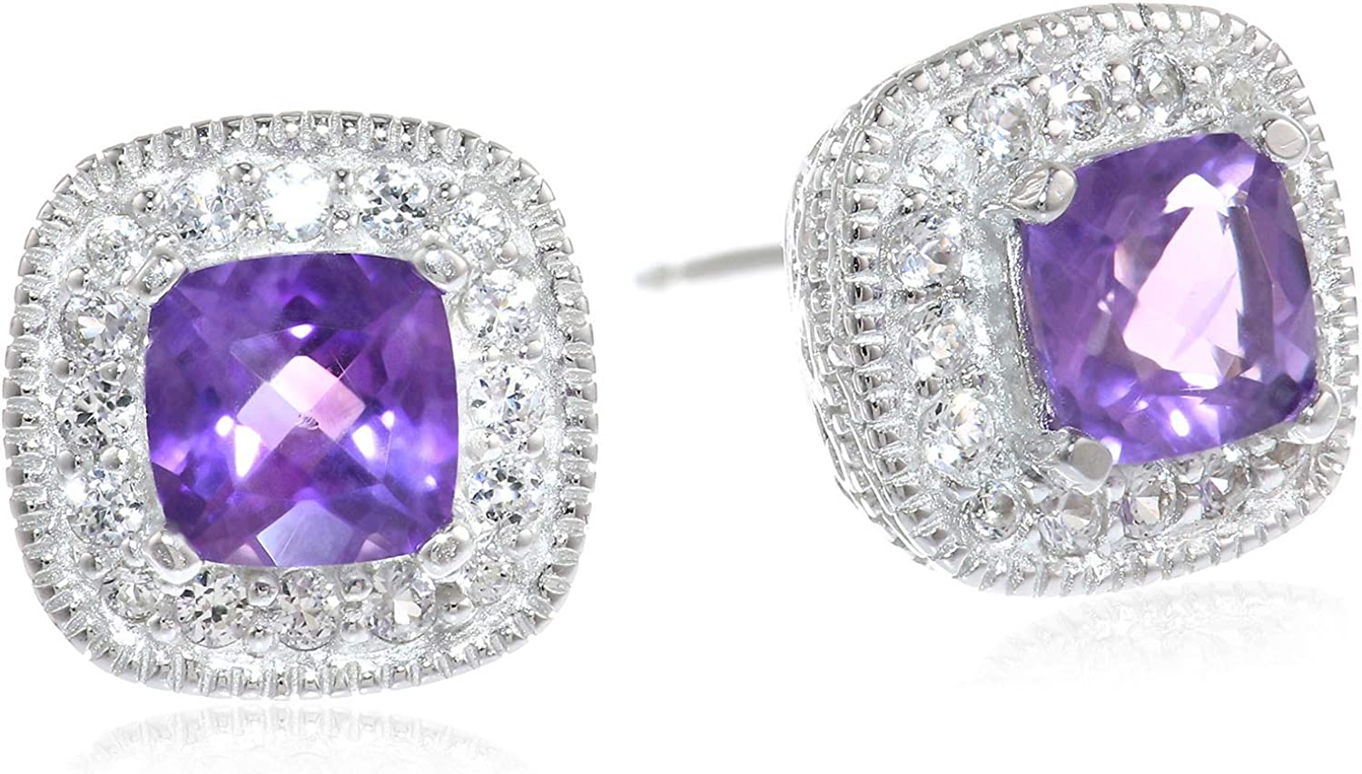 Elegant stud earrings featuring cushion cut 5mm created aquamarine stones with halos of created white sapphires and intricate milgrain detailing in 925 sterling silver