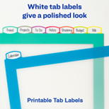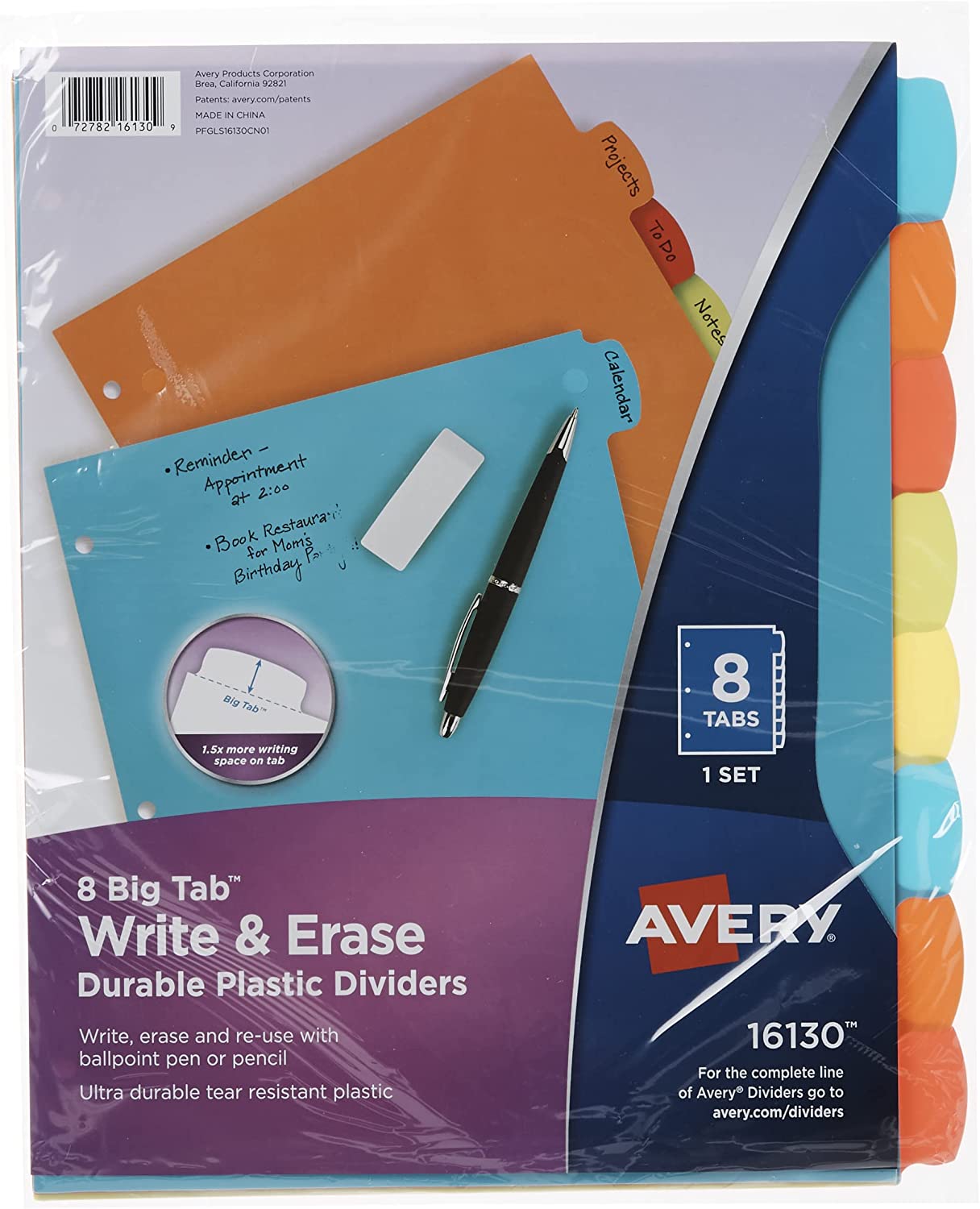 These Big Tab Write & Erase Durable Plastic Dividers let you write, erase and reuse your 3 ring binder dividers for easy changes at any time. Simply write directly on the stylishly shaped tabs with a ballpoint pen or pencil, and erase as needed. You can also take quick notes on the 8.5” x 11” plastic divider body and easily erase later. Made from ultra-durable, tear-resistant plastic, these dividers can be wiped clean with most non-abrasive household cleaners and are ideal for frequent use in any 3 ring binder. The Big Tab design offers 1.5 times more writing space than standard binder dividers with tabs, and the multiple bright colors allow for quick referencing. Ideal for your personal organization at home, work and school. This item comes with a set of 8-tab dividers for a total of 8 multicolor dividers.