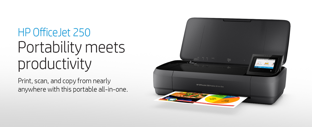 Print, scan, and copy from nearly anywhere with this portable all-in-one. Detect and connect to a nearby OfficeJet 250 and print using Bluetooth® Smart or Wi-Fi Direct. Ideal for mobile professionals and telecommuters who need a high-quality, reliable, portable all-in-one they can take virtually anywhere. Quickly print, copy, and scan multipage documents hands-free with the 10-page automatic document feeder and color touchscreen. This durable, compact all-in-one fits in your car, backpack, and more for convenient printing anywhere. Start printing right out of the box with quick and easy setup. Get the highest page yields of any in-class all-in-one, using Original HP cartridges. Plug in your AC power source to charge within 90 minutes while the printer is off.