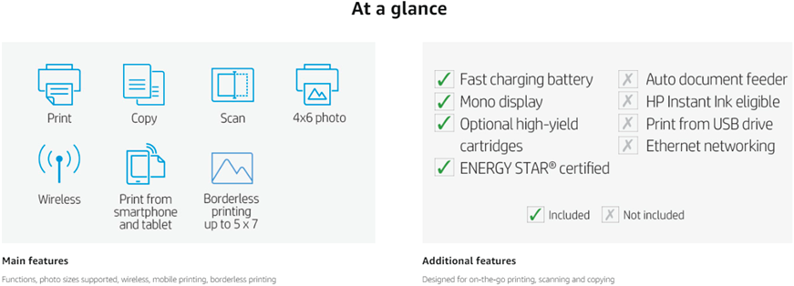- Main functions of this HP all-in-one portable printer: scan, copy, easy portable printing wherever you need it, wireless Print from your laptop or mobile devices, 2. 65" Color touchscreen, auto document feeder, and more