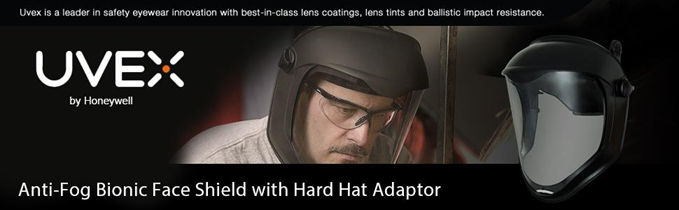 Protect yourself from impacts, splashes and airborne debris with the Uvex Bionic Face Shield with Hard Had Adapter and Clear Polycarbonate Anti-fog/Hardcoat Visor. The full shield design offers extended top-of-head coverage plus built-in chin protection. The clear polycarbonate visor provides excellent optics with anti-fog/hardcoat coverage for clearer vision in any work environment. A versatile hard hat accessory lets you combine your face shield comfortably with most hard hats for complete protection on the job. The replaceable visor is available in multiple tint options and the construction contains no metal parts to ensure safety in electrical work environments. From a comfort standpoint, this face shield features cell foam padding at the back and a dual-position setting to customize the fit. It is also lightweight and ergonomically designed for optimum balance during wear. This safety shield must be worn overtop of other safety eyewear, and fits well with most goggles and respirators. Meets ANSI Z87.1-2010 and CSA Z94.3 standards.
