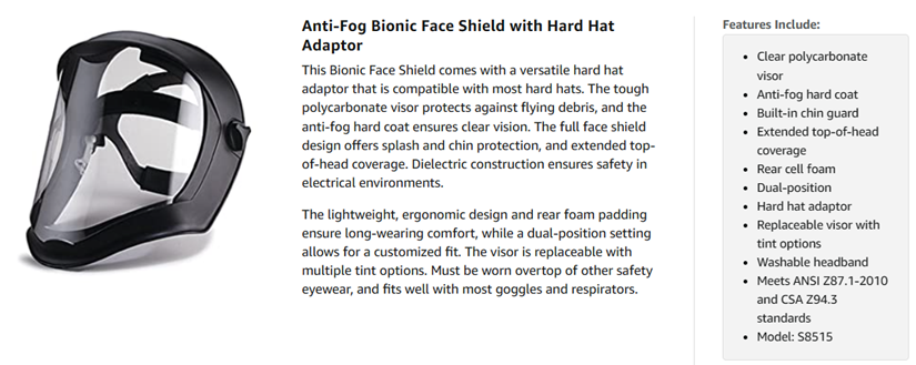 The Uvex Bionic Shield is a revolutionary face shield. Designed for rugged jobs, it's tough where it has to be, yet extremely lightweight and balanced for all-day comfort. Its technologically advanced design enables the Bionic Shield to more easily stand up to airborne debris, splash and welding infrared radiation. The Bionic Shield is 100percent dielectric and contains no metal parts. It meets ANSI Z87.1-2003 and (High Impact) and CSA Z94.3 standards. Highly adjustable, with an easily replaceable visor, the Uvex Bionic Shield is the face shield workers want to wear. Made in the USA.