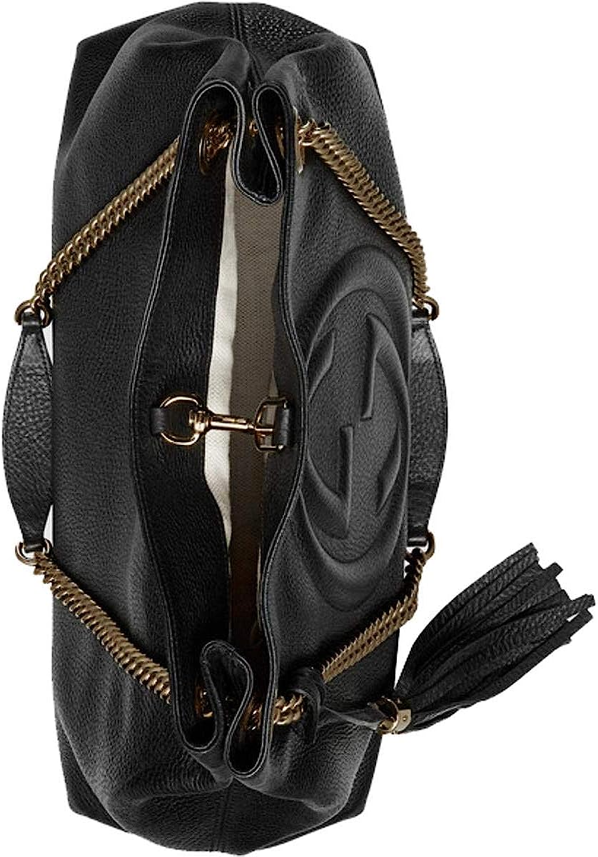 • This Gucci black leather bag features the interlocking GG logo. It is large enough to carry all of your essentials in style. The shoulder straps are made of gold chain, but come with leather shoulder padding for comfort. This designer handbag goes great with everyday looks and is super classy.