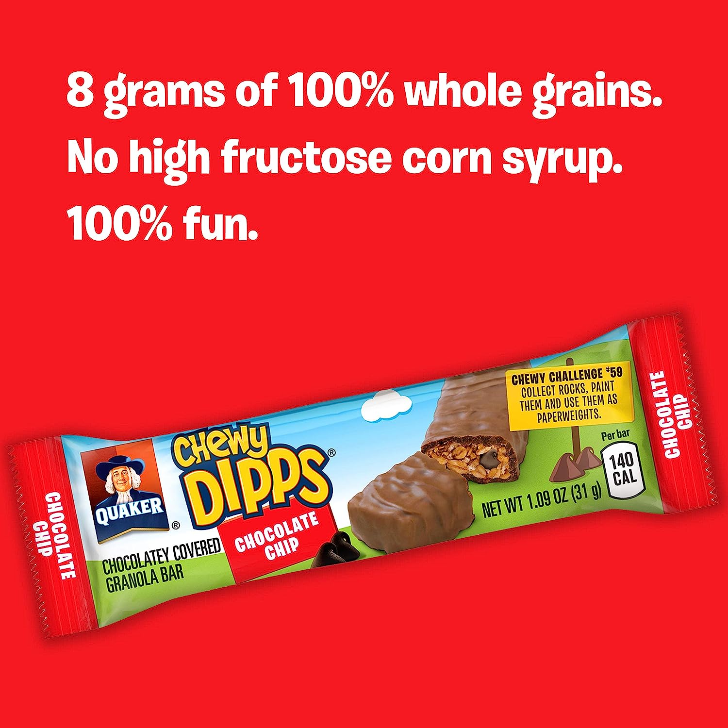 About this item Includes 58 individually wrapped granola bars you can enjoy at home, at school, or on the go Features 12 chocolate chip, 12 peanut butter chocolate chip, and 10 s'mores flavor Chewy granola bars, plus 12 chocolate chip and 12 peanut butter flavor Chewy Dipps chocolate covered granola bars Made with real rich chocolate, indulgent peanut butter-flavored chips, and toasted granola Packed with 8 grams of 100% whole grains per bar. No high-fructose corn syrup At only 150 calories or less per bar, Quaker Chewy and Dipps bars are a perfect snack for any occasion