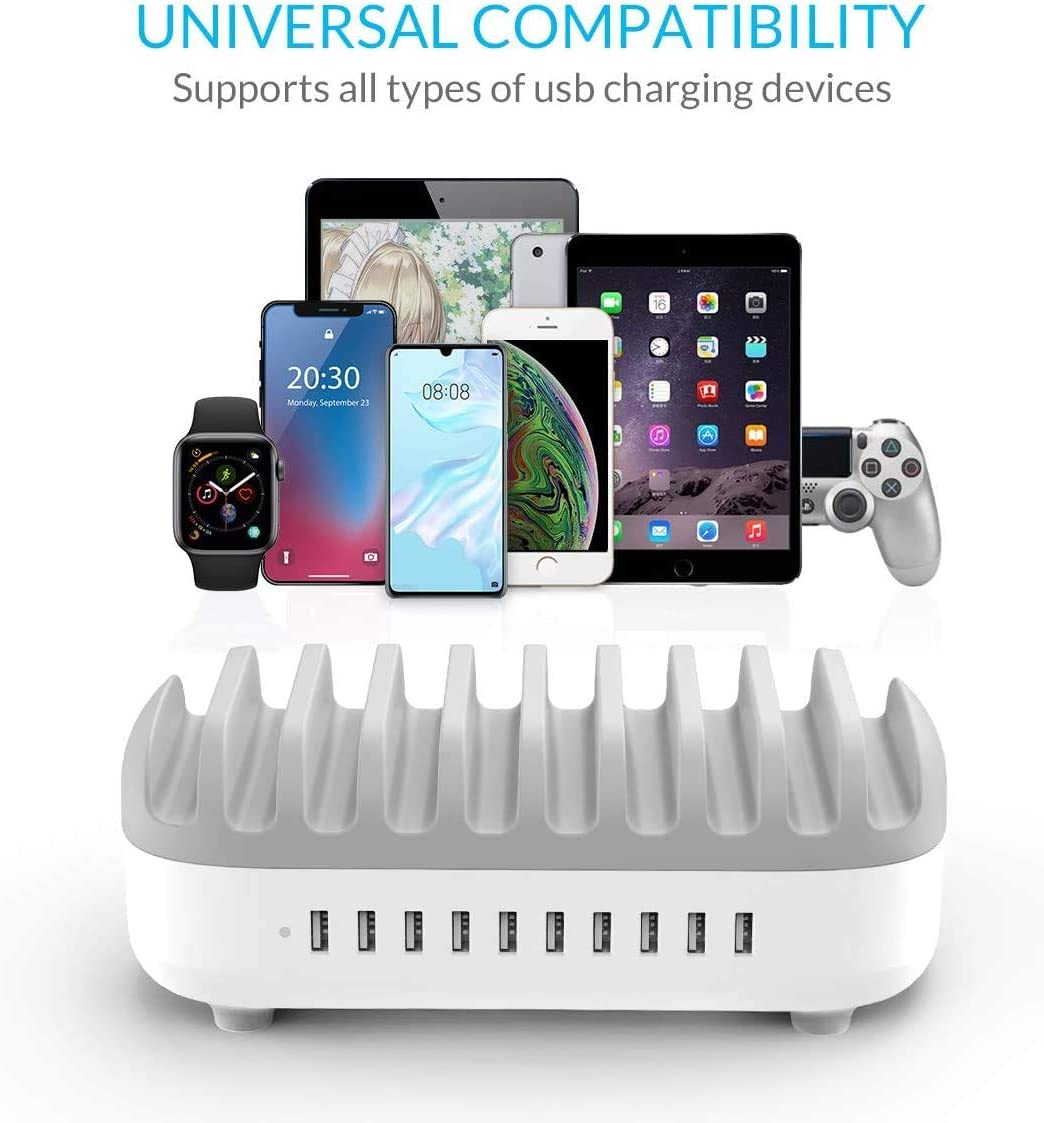 • 【TIDY & ORGANIZED】this 10 USB Ports charging docking station designed with thick and all-in-one undetachable partitions that keep your devices sit upright and will not lean over, It can charge 10 electronics at full speed simultaneously, You do not have to plug a bunch of chargers on your power outlet for every phone and tablet you have. Keep everything in one place, No longer wasting your time to wait so you can spend more time with your family and friends.