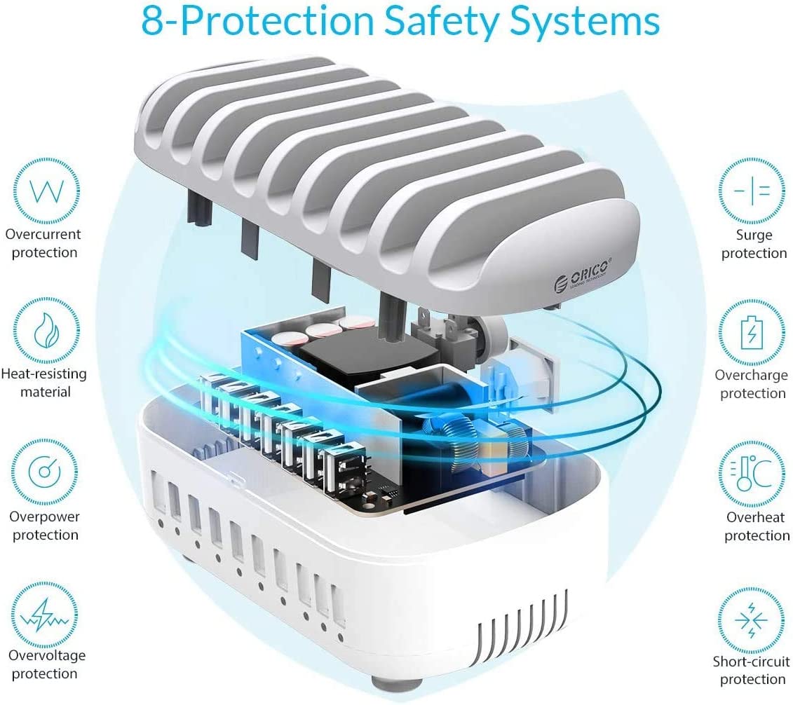 • 【SAFE & INTELLIGENT USB CHARGER】Built-in surge protection against overcharging, surges and overheating, short circuit protection, overload protection, And Even when 10 devices charged simultaneously, Built-In smart chip automatically recognize, adjusting and distributing the optimal output, each device can get the max charging speed.